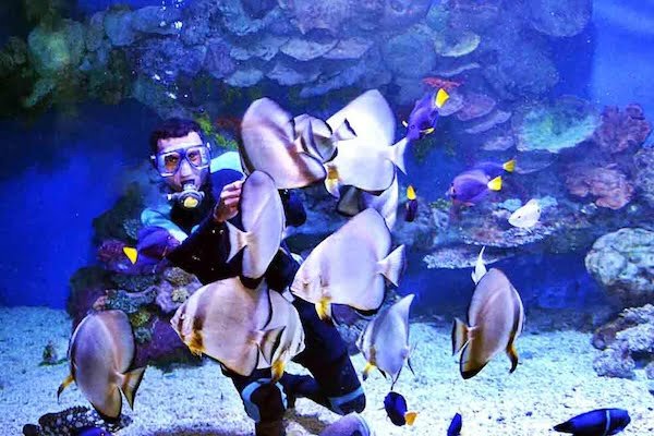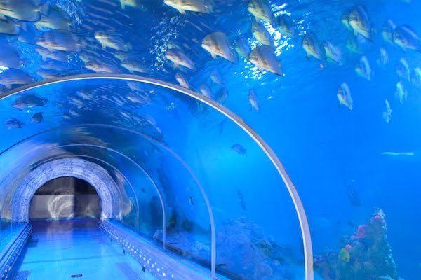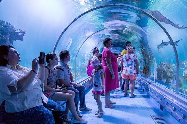 Dans l'aquarium, vous visiterez 24 galeries distinctes, avec toutes sortes de poissons vivant dans la mer Rouge, notamment le tunnel des requins, la forêt tropicale et la vallée des baleines, basées sur des fossiles trouvés dans le désert occidental.